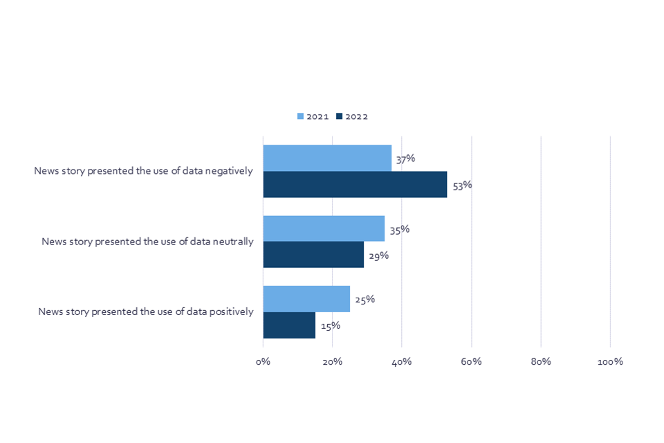 Bar chart that shows the change in the proportion of respondents that said a news story they recalled about data presented the use of data either negatively, neutrally, or positively, in 2021 and 2022.