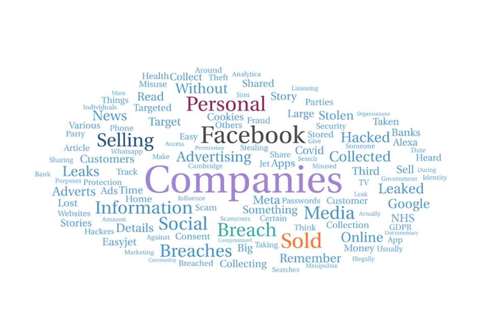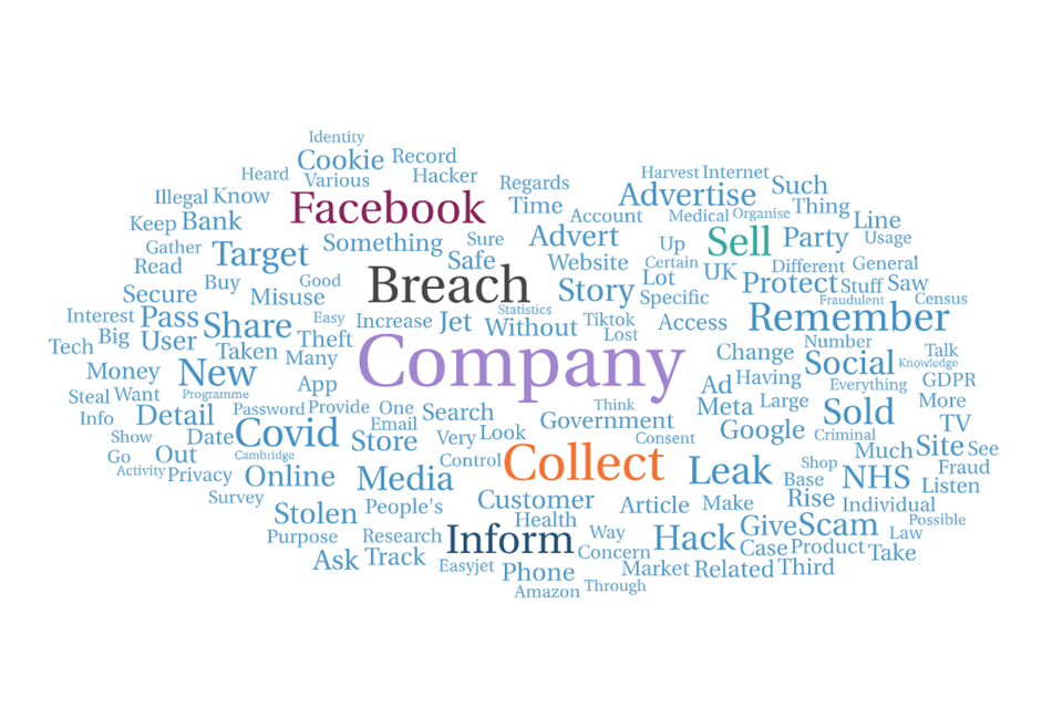 Q10. In a couple of sentences, please could you briefly tell us what the story you saw about data was about? Base: All online respondents who say they have seen a news story about data in the last 6 months, and who say that story was mainly negative, and who have high digital familiarity: Jun/Jul ’22 (Wave 2) n=596. Size of words corresponds to the number of times they occur in responses. All words mentioned four times or less are removed.