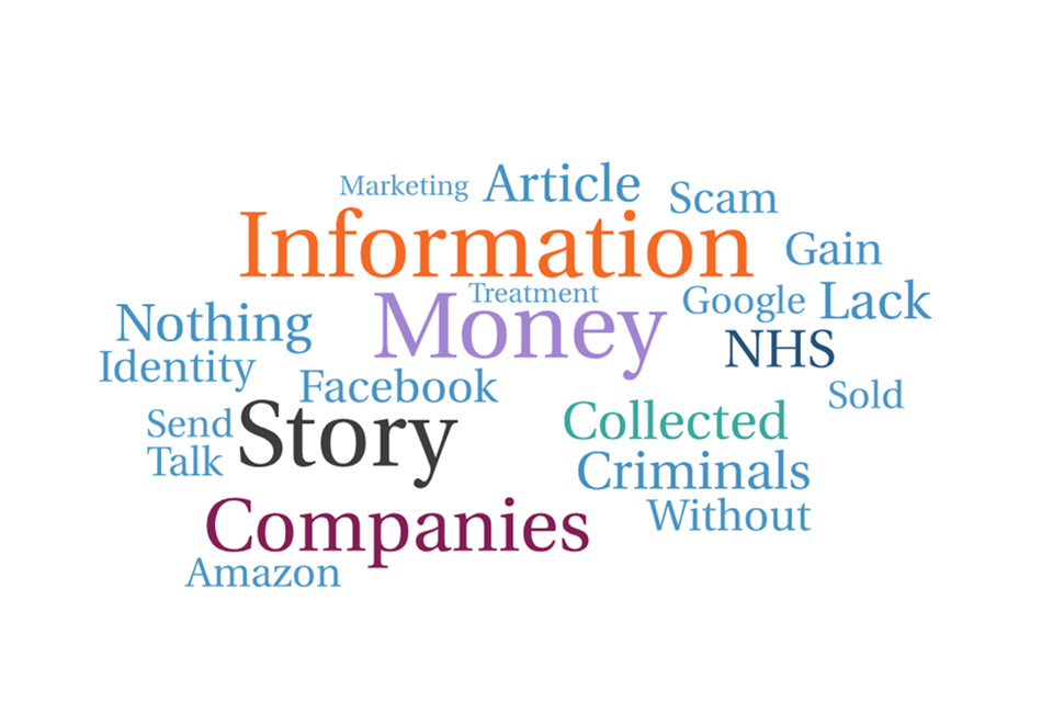 Word cloud of public recall of data-related news stories – by UK adults who recall that the story was mainly negative, and have high digital familiarity.