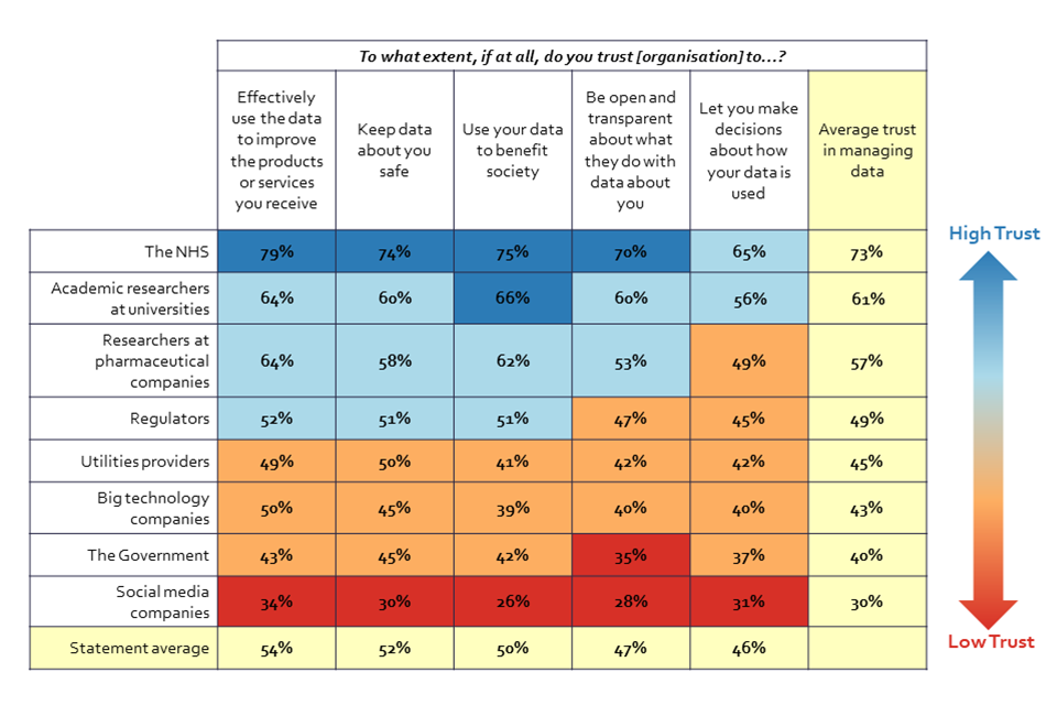 Table 1: Trust in organisations, and in their actions with data (Showing % Sum: Trust)