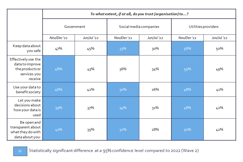 Some significant changes in overall trust levels have been recorded since the previous survey wave. Firstly, overall trust in the government and utility companies and their data practices has fallen since 2021 (40% to 33%, and 61% to 46% respectively).