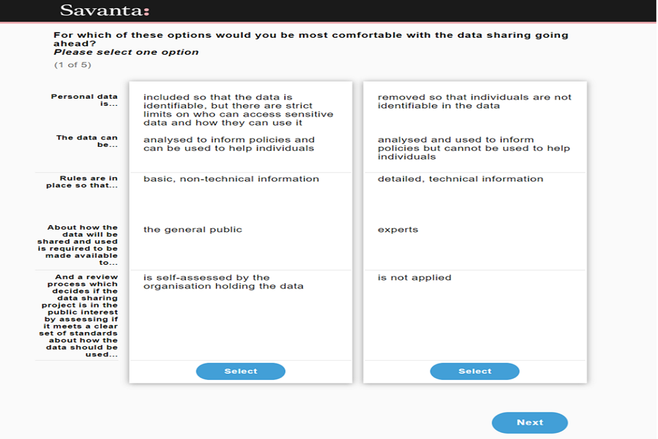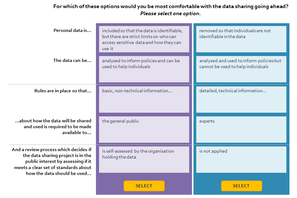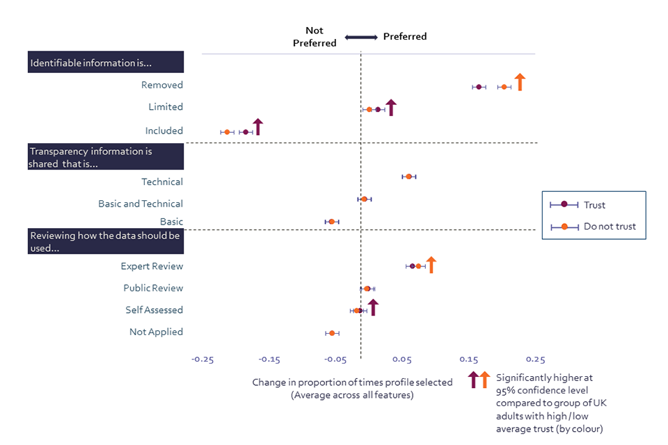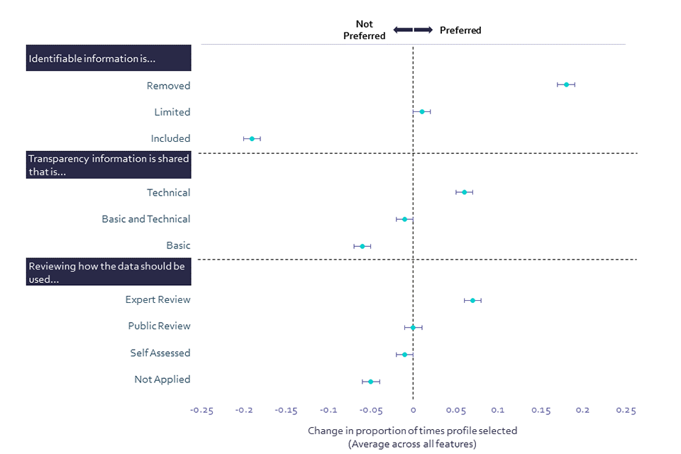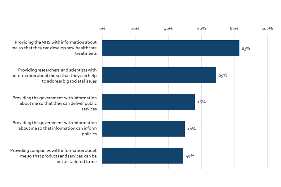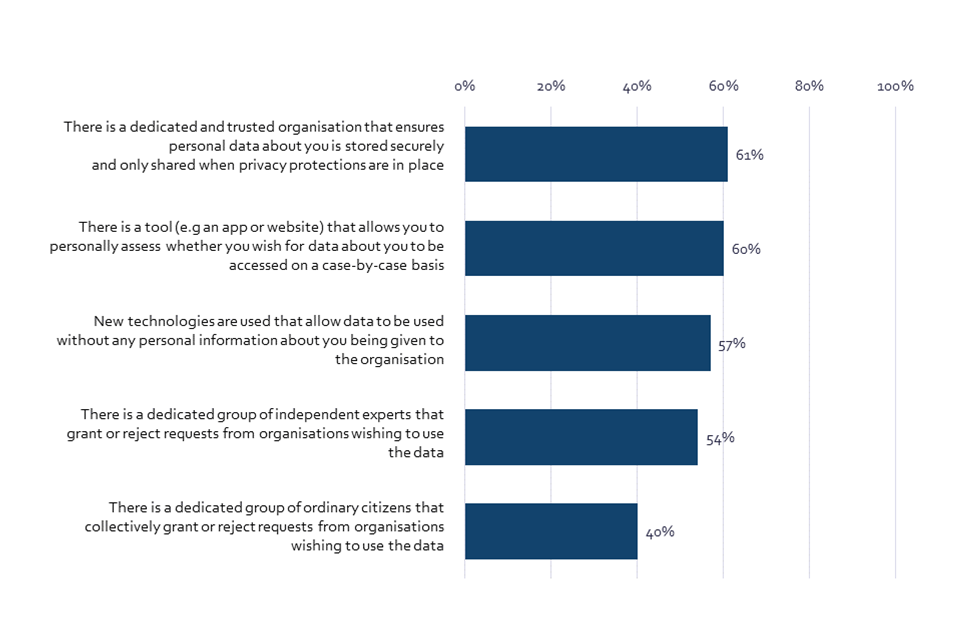 When it comes to data governance, people want their data to be managed by experts, and for the privacy of their data to be prioritised. ‘Identifiability’ stands out as the most important consideration for an individual to be willing to share data, and UK adults express a clear preference that they are not personally identifiable in data that is shared. People also express a preference for experts to be involved in the decision-making process for data sharing, over a public or self-assessed review.