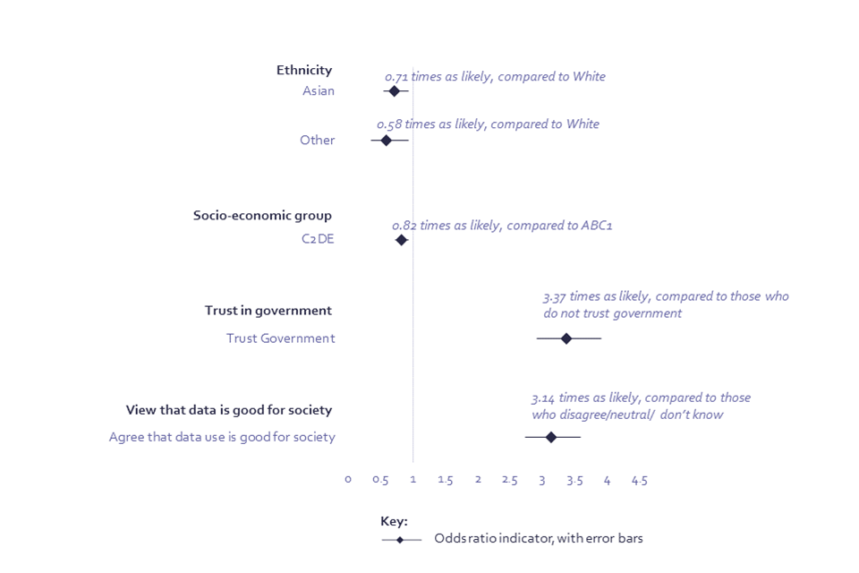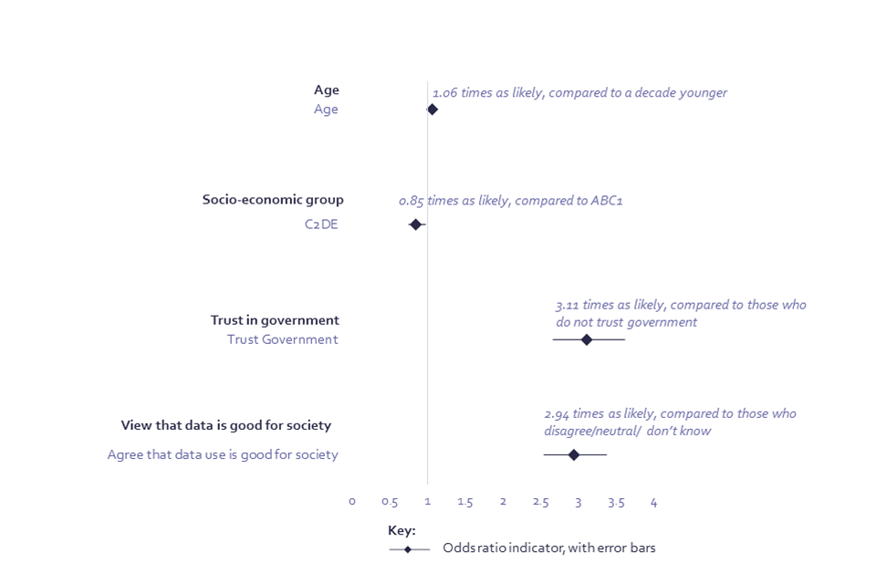 Regression analysis[footnote 1] indicates greater agreement for both of the abovementioned statements amongst younger respondents and respondents from a higher socio-economic grade (ABC1)[footnote 2] in comparison to older respondents and those from a lower socio-economic grade (C2DE) (Annex, Models 1 & 2). This suggests greater optimism amongst these groups when it comes to the use of data in society.