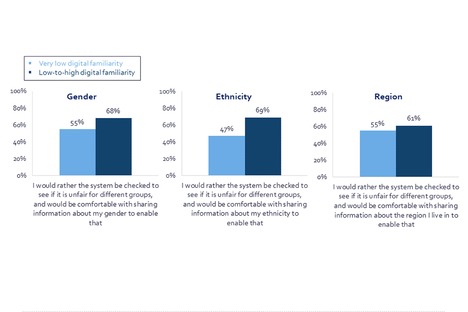 While identifiability is the most important criterion driving willingness to share data, the wider UK adult population is willing to share demographic data for the purpose of evaluating systems for fairness towards all groups. The proportion of people who would be comfortable sharing information about their ethnicity, gender, or the region they live in, to enable testing of systems for fairness is 69%, 68% and 61% respectively. In comparison, adults with very low digital familiarity are less comfortable sharing information about their ethnicity (47%), gender or region they live in (both 55%).
