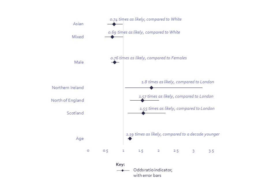 Logistic regression provides us with an ‘odds ratio’. This tells us the odds of someone with a particular characteristic or attitude reporting, for example, that they agree with a statement, compared with someone with another characteristic or attitude, after taking other possible influences into account. ↩