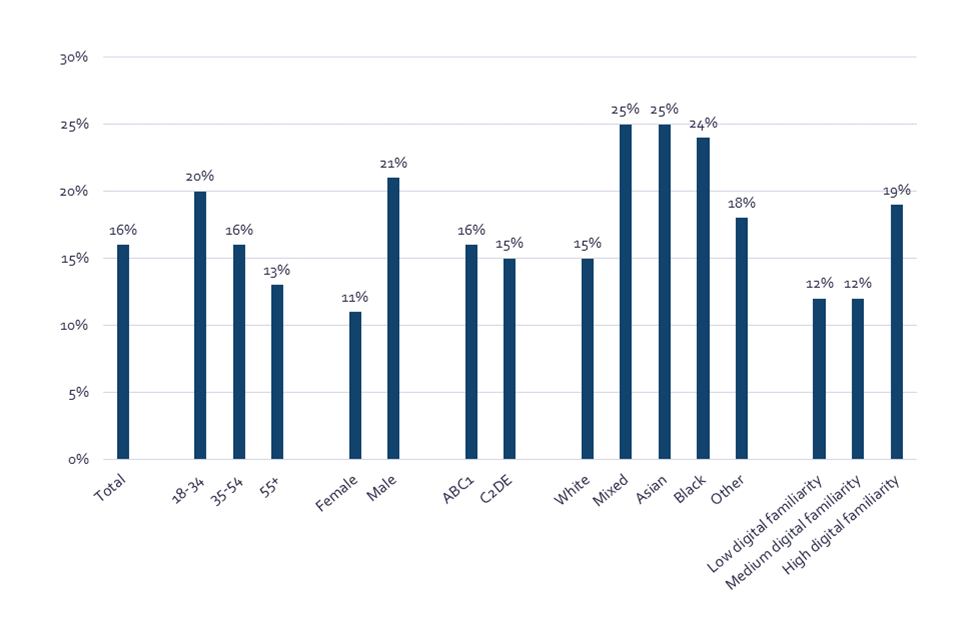 Throughout this report we refer to socio economic grade or “SEG”, with the main SEG categories being AB, C1, C2 and DE. Those in the AB category occupy higher or intermediate professional, managerial or administrative jobs; students or those in clerical or junior managerial, professional or administrative roles fall into the C1 definition. C2 comprises skilled manual workers and D semi- or unskilled manual workers. Those who are not in paid work, are homemakers or carers, are in casual work or are retired fall into category E. ↩