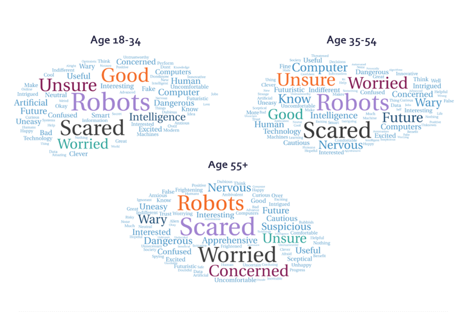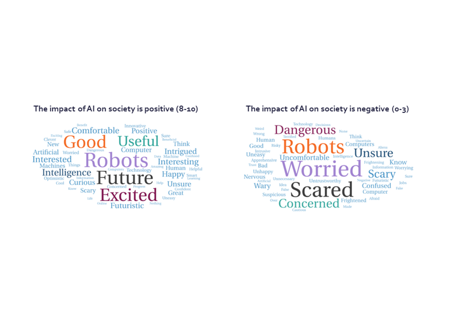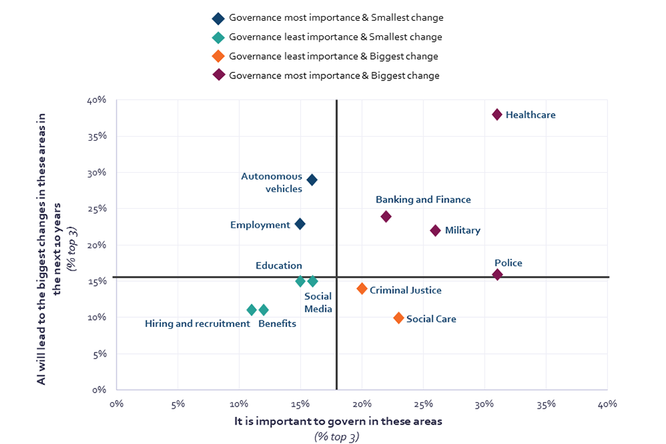 The UK adult population has a positive expectation that AI will improve the efficiency and effectiveness of regular tasks. However, public views are split on the fairness of the impact of AI on society, and on the effect AI might have on job opportunities. People have higher demands for governance in AI use cases that are deemed higher risk or more complex, such as in healthcare and policing. Healthcare is the area in which UK adults expect there to be the biggest changes as a result of AI. However, overall AI still ranks fairly low against other societal concerns, signalling this is not yet a front of mind topic or concern for people.
