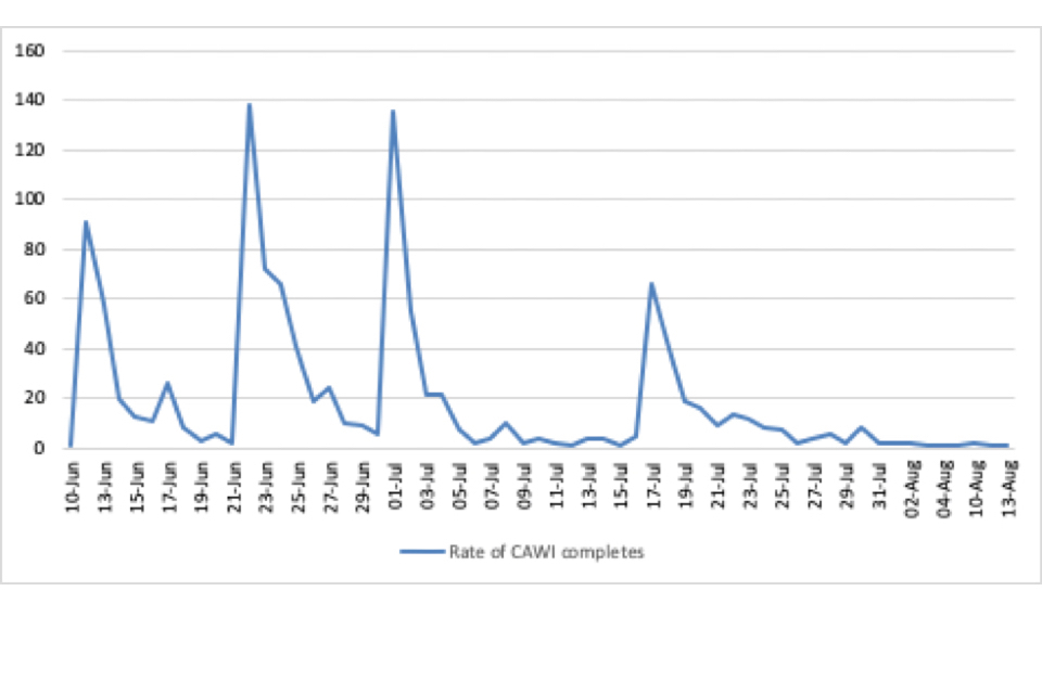 Postal to online completions saw an entirely different rate of delivery, as illustrated below in Figure 3. Spikes in numbers of completes can be attributed to the sending of initial invitation letters and subsequent rounds of reminder letters, each instigating a near-instant response.