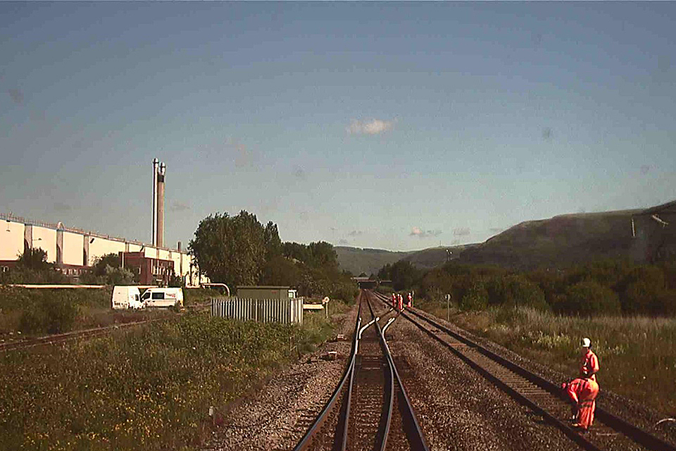 FFCCTV image looking towards Port Talbot from a train on the down main line at approximately 09:24 hrs, showing the two groups working on the open up main line approximately 100 metres apart