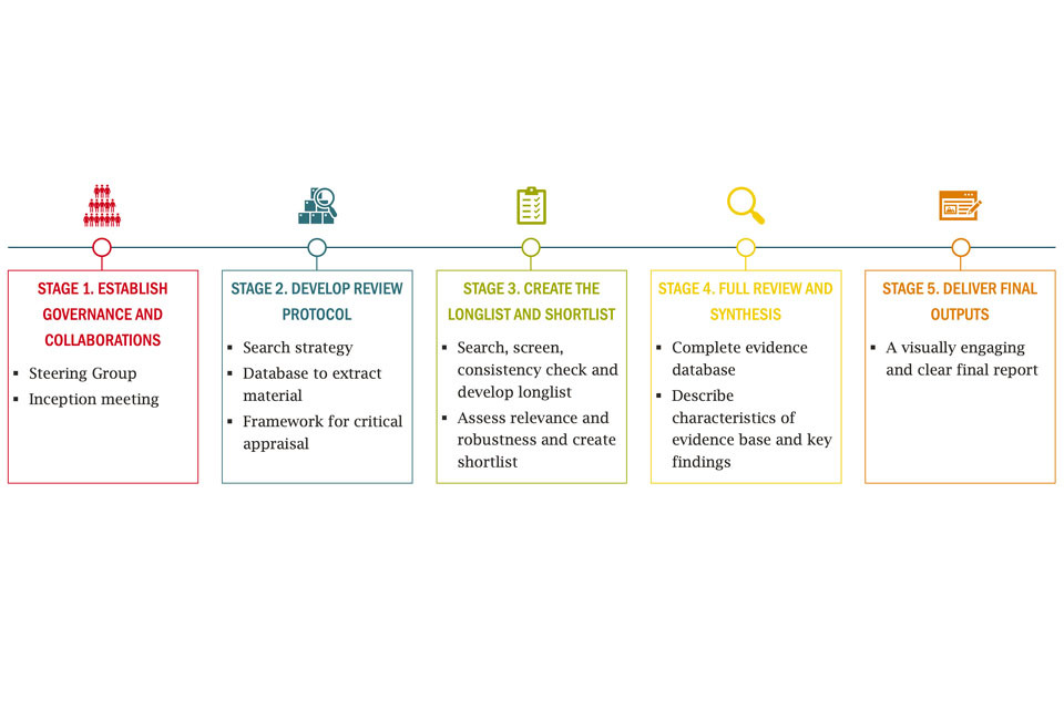 For stage 1 of this approach, the governance and collaborations were swiftly identified and a Steering Group comprising members from DCMS and DLUHC, which met (virtually) weekly, was set up. Stage 2 was undertaken over a period of three weeks and resulted in a review protocol that was discussed and agreed with the Steering Group. This was important as it confirmed the scope, approach and actions to fulfil the remaining stages of our approach.