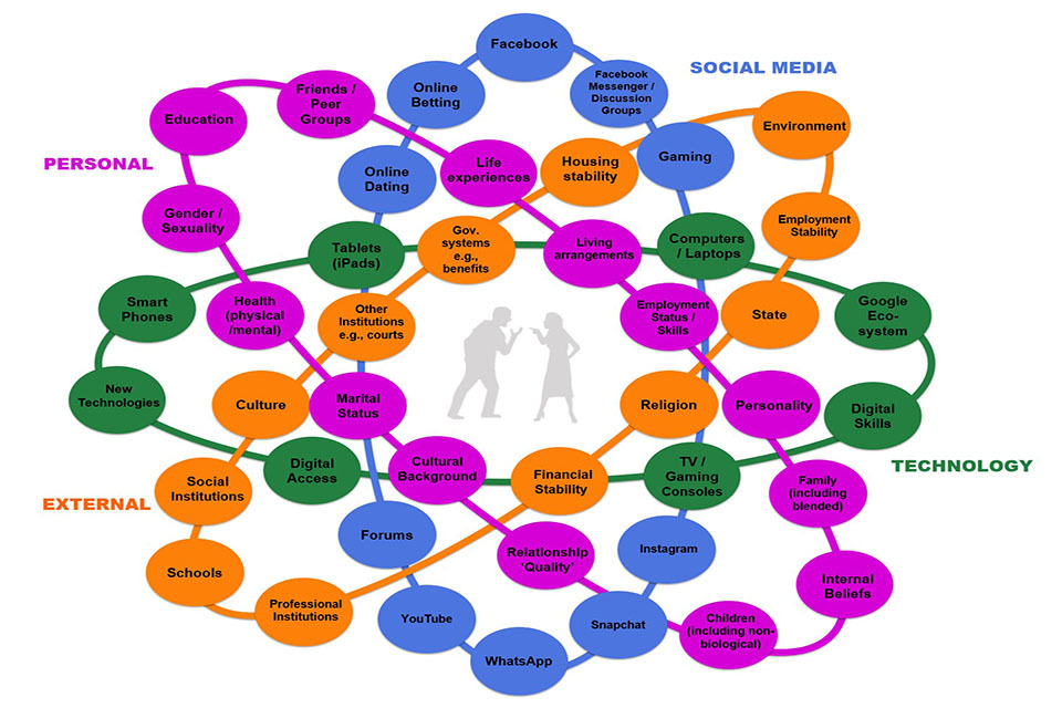 15. The graphic below shows how personal factors (such as relationship quality and life experiences) and external factors (such as financial stability and public services, such as benefits) interact within the wider parental conflict landscape. The growth of social media, such as Facebook and Instagram (which depend on users producing content), along with the rise of technology such as Google (predominantly being the search engine of choice) and smartphones for on-the-go access to the internet, means that digital plays an important role in the lives of mothers and fathers and could present opportunities to engage with them about the conflict in their relationships.