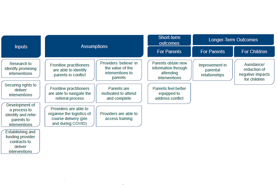 The original programme involved testing 8 evidence-based interventions to address parental conflict in 31 local authorities, in four geographical areas (Contract Package Areas). For the purposes of the test, the interventions were rated as high intensity or moderate intensity, based on the typical cost and duration of support provided to parents. Some interventions were for separated parents, some were for intact couples and others for both family types. A key part of the evaluation was to understand the effects of participating in these interventions on parents and their children.
