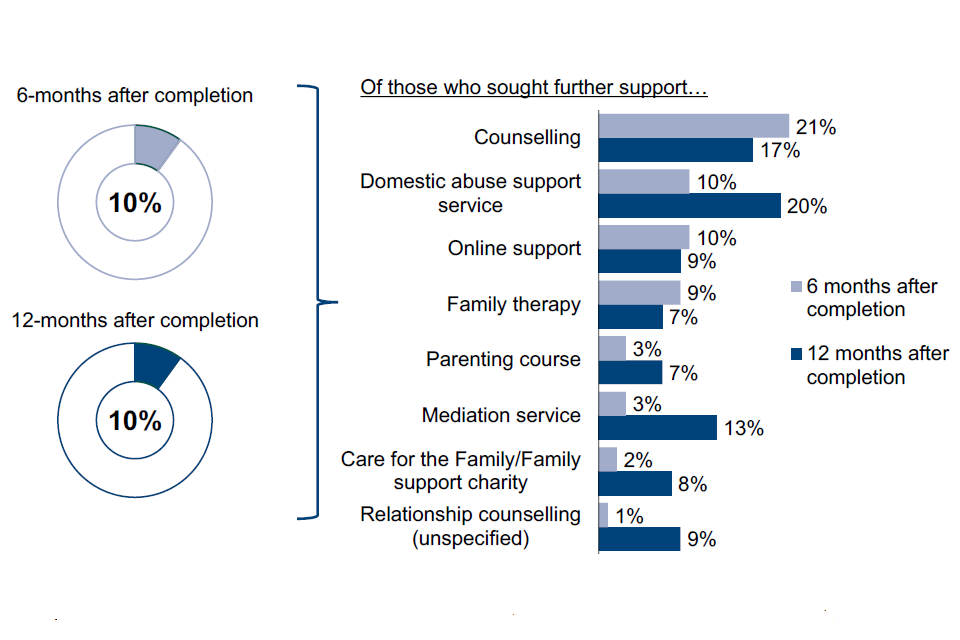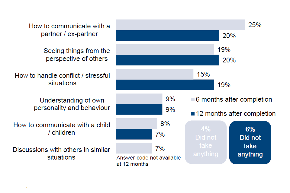 As only one in ten parents sought relationship support, the bar chart is based on a small number of parents. For example, 10% of 86 parents sought support on domestic abuse 6 months after completion, and 20% of 37 parents sought this support 12 months after completion. ↩