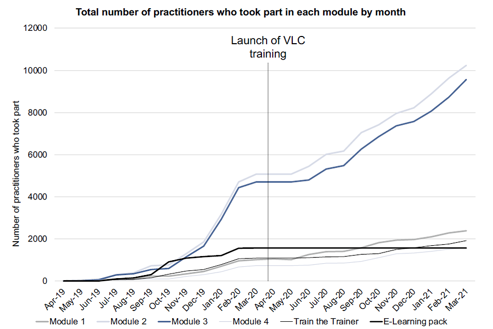 - overall, the transition to digital delivery of training went well, the number of practitioners taking part in the training remained steady, though each practitioner generally took part in fewer of the four modules after the move to VLC.