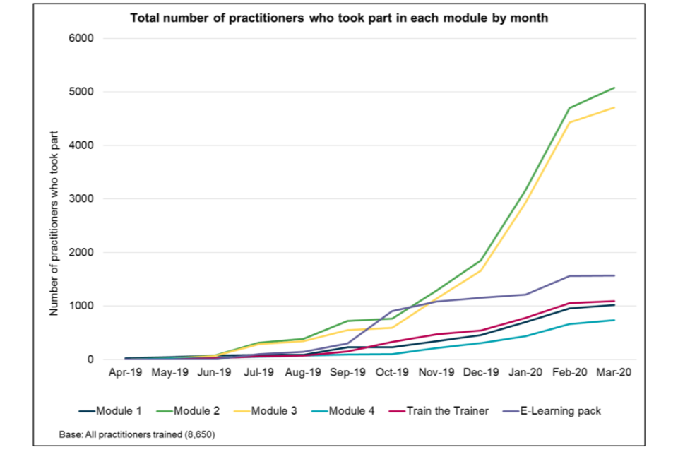 - 45 depth interviews with practitioners taking part in the training. The interviews covered expectations of the training, what they felt about the content and delivery of the training and how they expected to be able to apply their learning in their day-to-day roles