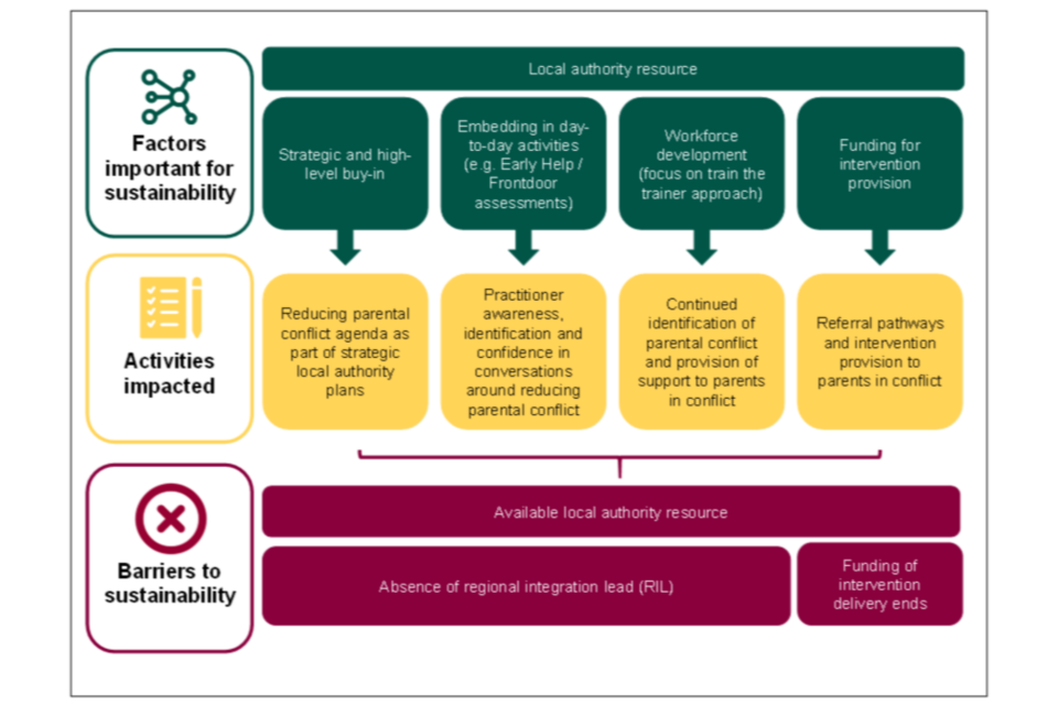Factors that were felt to help with sustainability included low/no cost changes that helped to embed consideration of parental conflict in day-to-day processes. These included changes to tools such as Early Help / Front Door assessment forms to record identification of parental conflict and processes to encourage practitioners to have conversations about parental conflict.