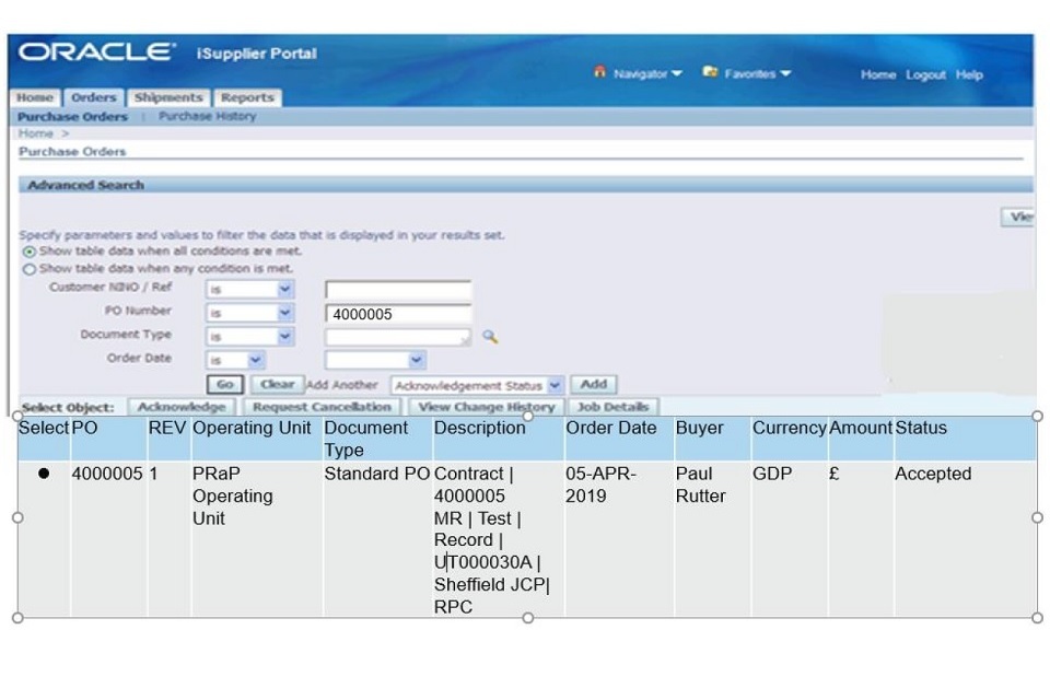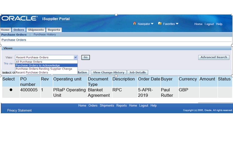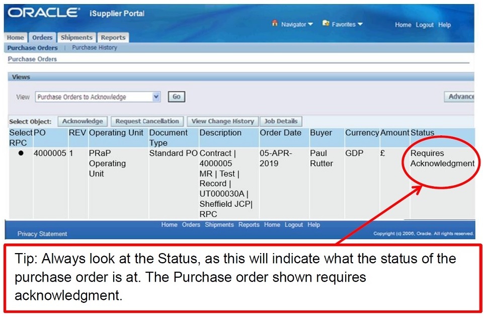 Tip: Always look at the Status, as this will indicate where the status of the purchase order is at. The purchase order shown requires acknowledgment.
