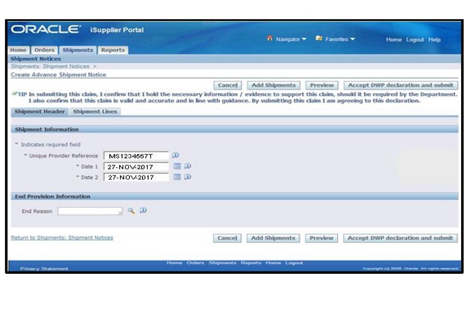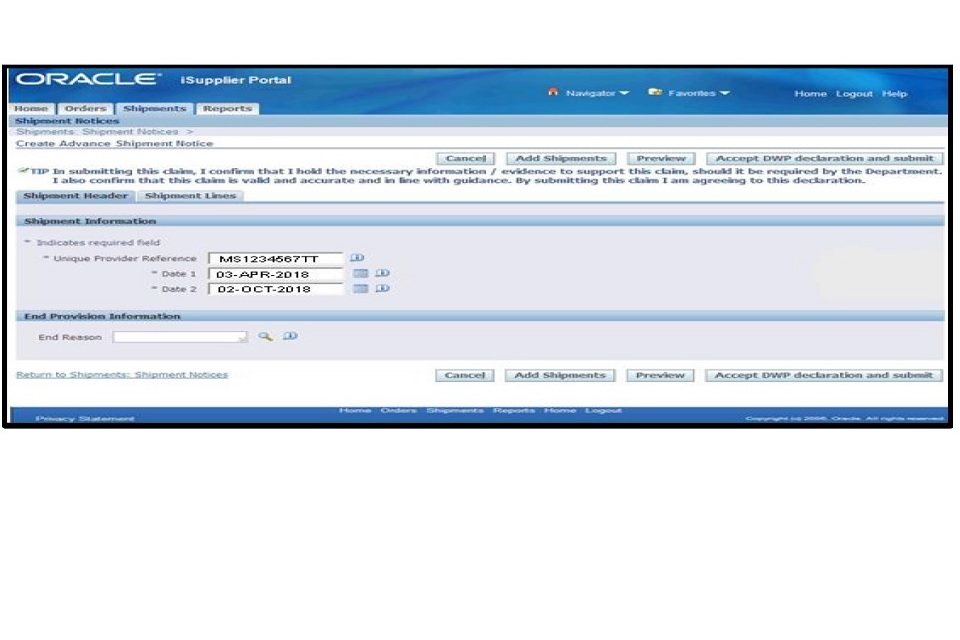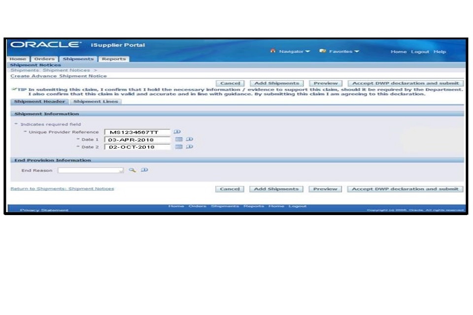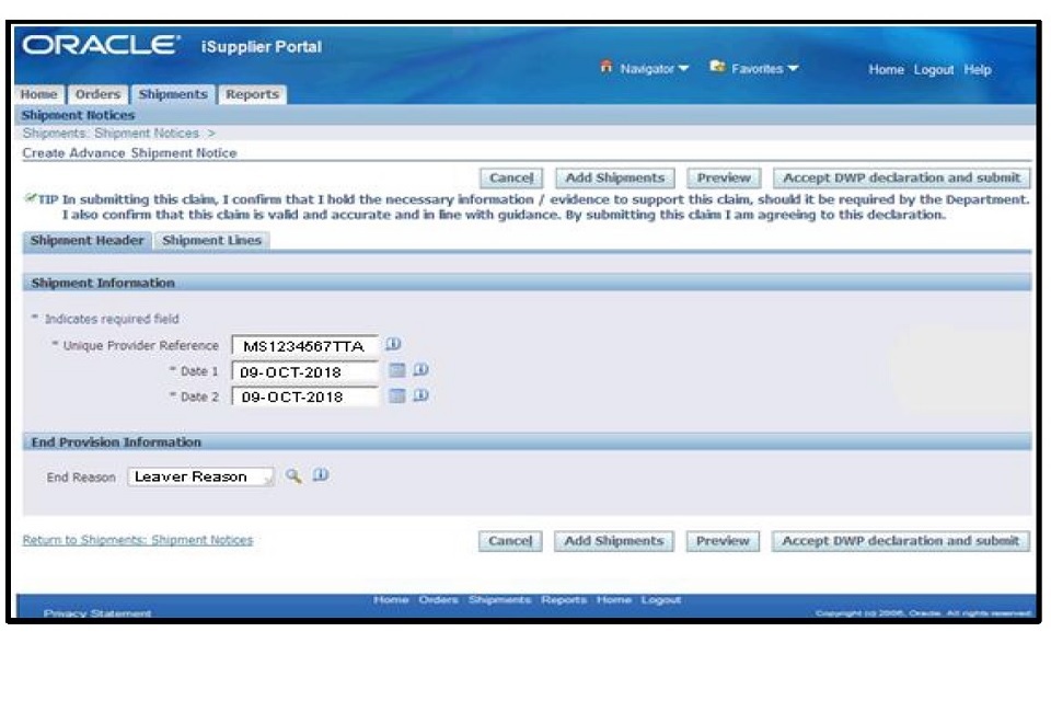 Once you are satisfied that all the fields have been selected read the DWP declaration and select ‘Accept DWP declaration and submit’ button.