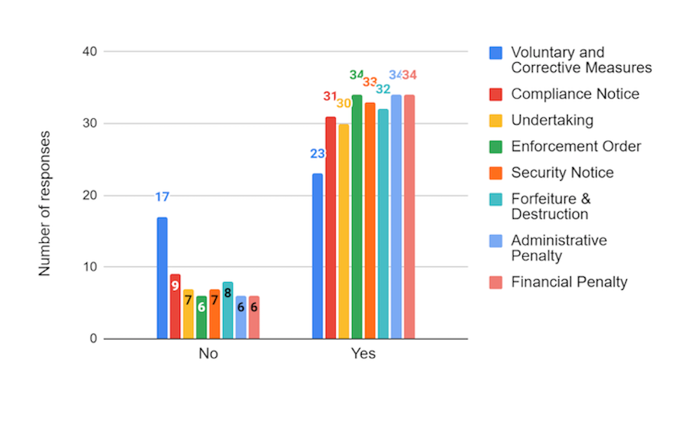 | Forfeiture & Destruction | 40 | 80% yes 20% no | 9 | Some respondents felt that this measure was too strong. One organisation highlighted that destruction may not be necessary if the issue is related to software. An individual suggested that this may not be effective, as businesses may not hold much stock and it may lead to organisations holding more stock overseas in order to minimise the impact of no longer being able to sell to the UK market. |