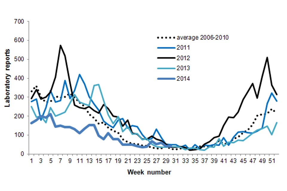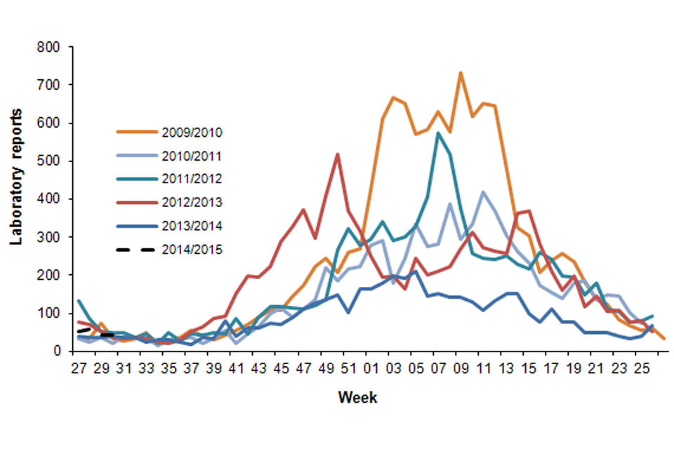 In the current season to date † (from week 27, 2014, to week 30, 2015), there were 195 laboratory reports of norovirus. This is 14% higher than the average number of laboratory reports for the same period in the seasons between 2007 to 2008 and 2011 to 2012 (171)*. The number of laboratory reports in the most recent weeks will increase as further reports are received.