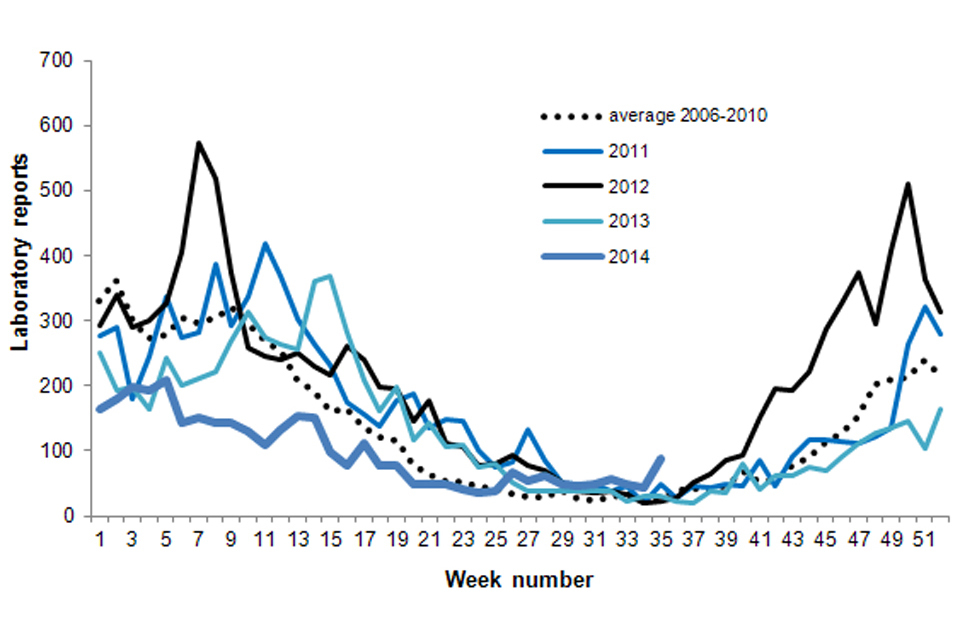 Figure 2. Norovirus laboratory reports in the current season, compared with previous years (to week 35)