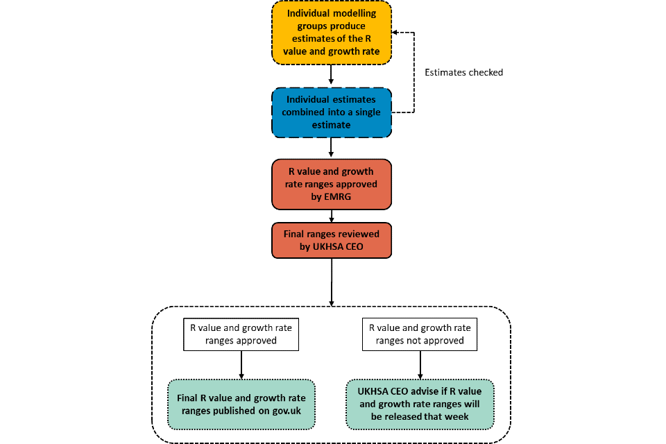 The final estimated ranges for the R value and growth rate are agreed by EMRG, with any requested changes implemented and checked by the EMRG secretariat. The final estimates are included in the EMRG regular consensus statement. The statement is approved by the UKHSA CEO.
