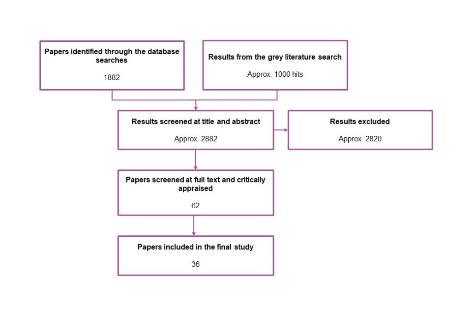 The screening process led to a shortlist of 36 papers. The shortlist was then sent to an academic subject expert, who confirmed that the list reflected their understanding of the research undertaken in this field. Given the low number of papers on this topic, a decision was taken to extract data from all 36 papers which met the inclusion criteria.