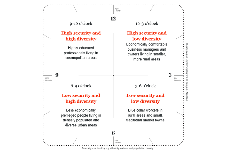 People located between 12-3 o’clock, for instance, are high in the bundle of measures we call ‘security’ but low in those we call ‘diversity’, and that will influence how they behave, think and feel.