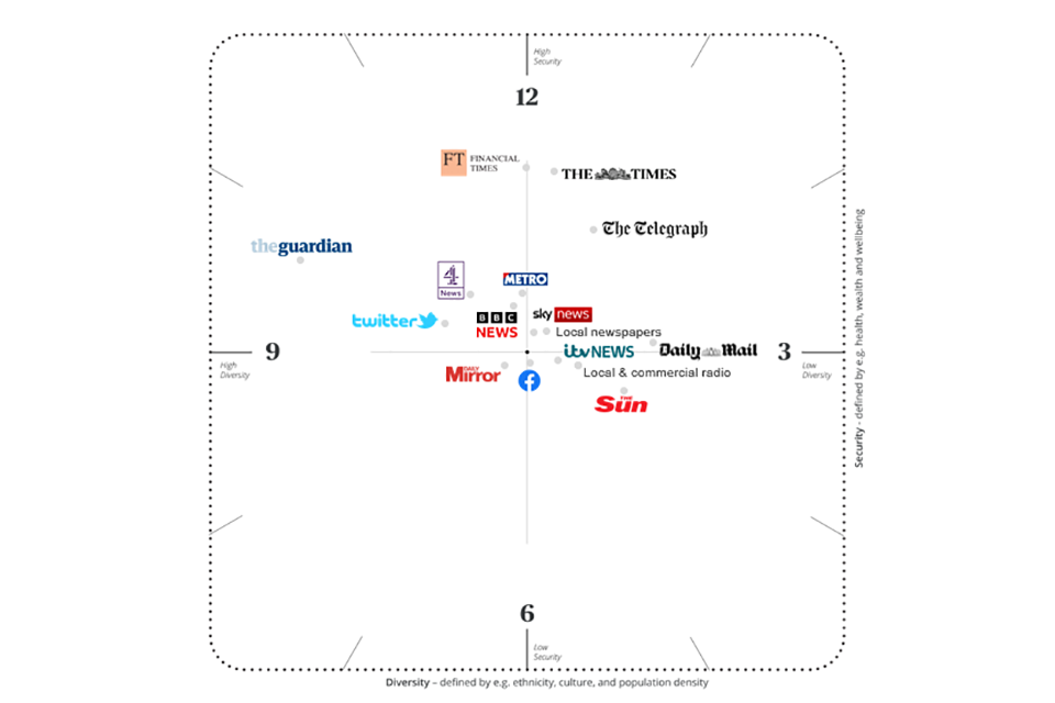 Here is the average position on the Clockface of those who say they get their news at least once a week from the sources shown. The Clockface image shows, for example, that you are most likely to find a reader of the Guardian in the high diversity, high security quadrant; a Sun reader in the low security, low diversity quadrant.
