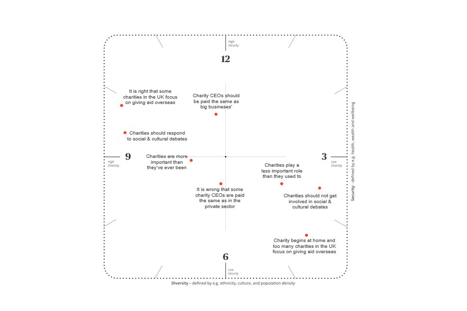 The Clockface image below shows that you are most likely to find supporters of overseas charities and those who think that charities should engage in social and cultural debates in the higher security, higher diversity part of the population. Those who think the opposite are most likely to be found in the lower security, lower diversity part of the population.