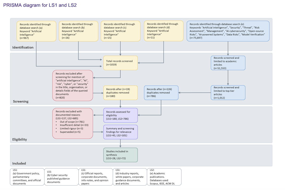 Consistent terminology was incorporated as search terms across both LS1 and LS2, including ìArtificial Intelligenceî, ìAIî, ìRiskî, ìCyberî, and ìSecurityî. Accordingly, we identified an initial batch of records from the following resources: 1) government policy, parliamentary committees, and official documents, 2) national cyber security guidance, 3) international reports, corporate documents, information notes, and opinion papers, 4) industry reports, white papers, and articles, all for LS1, and academic publication databases for LS2. We assessed records for eligibility by evaluating the scope, detail, and rigour of the papers, and whether the work had been superseded by newer iterations. We then manually evaluated each articleís relevance to this specific study for inclusion in the final synthesis of information gathered. This comprehensive search helped identify the key related works to inform the study. However, the sources included were restricted to English-language, with materials in all other languages excluded from consideration. Also, no limit was applied based on the year of publication. Limiting the resources by recent years may result in overlooking influential contributions that have shaped the field of AI. A comprehensive approach that encompasses both older and recent literature was applied to ensure a more thorough understanding of the research landscape. Details of each stage of the PRISMA method employed in this study is provided in the diagram below.