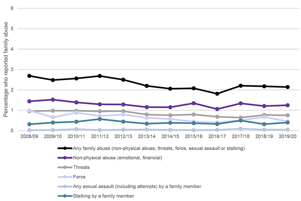 As Figures 2 and 3 show, non-physical abuse is the most prevalent type of domestic abuse reported by respondents. The proportion of those reporting non-physical abuse by a partner has remained at around 3% of adults aged 16 to 59 since 2012/13. The proportion of those reporting non-physical abuse by a family member has remained between 1% and 1.5% since 2008/09.[footnote 9] Force, threats and stalking behaviours were also experienced by victims of both partner abuse and family abuse. Domestic abuse-related sexual assault (including attempts) was less prevalent in family abuse (0.05%), but 0.4% of CSEW respondents reported having experienced it at the hand of a partner in the 2019/20 survey.