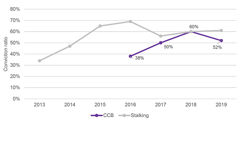 While volumes of CCB offences being recorded have increased each year, the proportion of CCB offences leading to a charge has decreased from 11% in 2017/18 to 6% in 2018/19.[footnote 7] However, falling charge rates have been seen across many offences over the same time period, and so do not necessarily reflect specific difficulties in charging CCB. A very high proportion of offences (85% in 2018/19) were finalised due to evidential difficulties (including where victims withdrew from the process), with both the literature review and the stakeholder engagement exercise highlighting that evidencing CCB is a significant challenge for police and prosecutors, likely due to the nature of CCB as a course of conduct offence that often includes non-physical abuse. Furthermore, while the conviction ratio for prosecutions (where defendants were charged withCCB as the principal offence) increased from 38% in 2016 to 60% in 2018; it then fell to 52% in 2019.