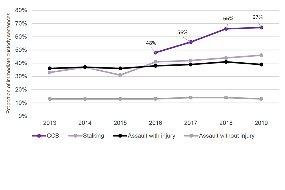 The number of CCB offences recorded by the police has increased from 4,246[footnote 1] in 2016/17 to 24,856[footnote 2] in 2019/20. In 2019[footnote 3], 1,112 defendants were prosecuted for CCB offences (either as the principal or non-principal offence[footnote 4]), which is an increase of 18% from the previous year. In addition, the average length of custodial sentences for CCB have consistently been longer compared with those for assaults (which are the most common domestic abuse-related offences recorded) and those for stalking[footnote 5].