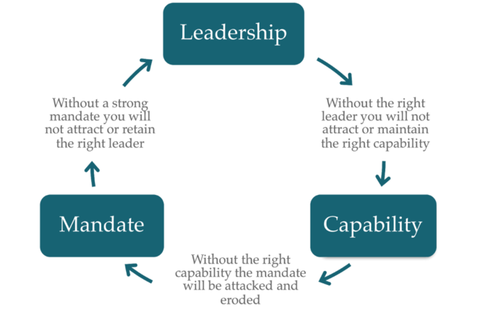 Three elements are essential for the Functional Model to succeed: a leader, with high technical credibility and the ability to lead; a critical mass hard core of high-end capability at the centre; and a strong mandate. These are closely interconnected, as this diagram illustrates. If any one of these is too weak, the whole function comes under pressure.
