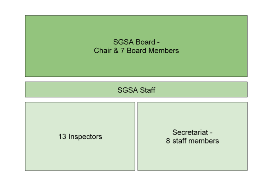 SGSA structure - Chair and 7 Board Members, SGSA staff, 13 Inspectors, Secretariat - 8 staff members