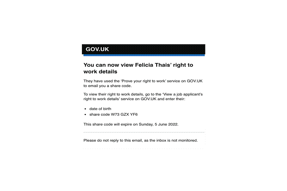 ‘Check a job applicant’s right to work: use their share code’ means the Home Office online checking service on GOV.UK which enables employers to check whether a person has a right to work and, if so, the nature of any restrictions on that person’s right to do so.