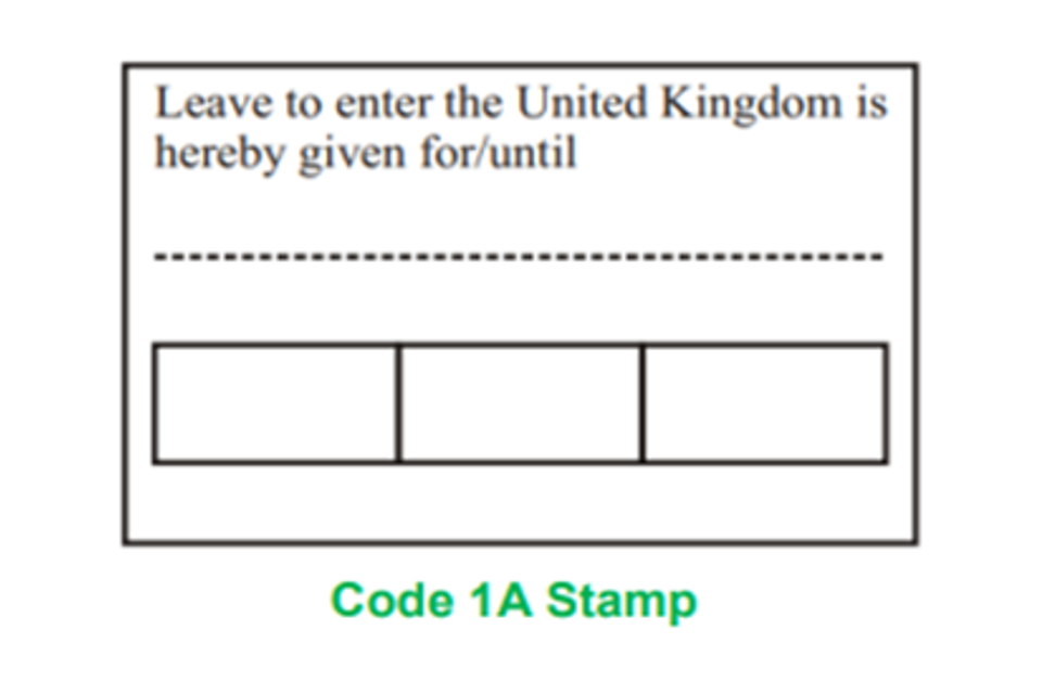 Example Code 1A and Code 1 stamps, endorsed with an Immigration Officer’s date stamp
