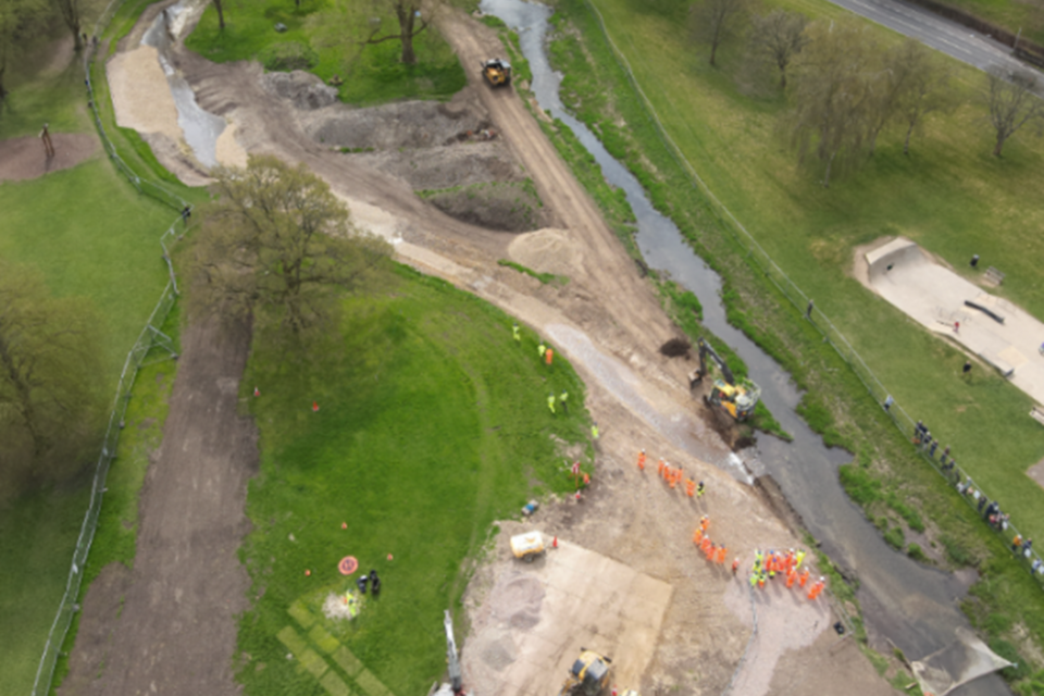 This project diverted 415 metres of river channel to the valley bottom through the park. The Bury Mill gauging station was replaced with an ultrasonic one to enable fish passage. Work progressed from 2018 with construction complete in June 2025.