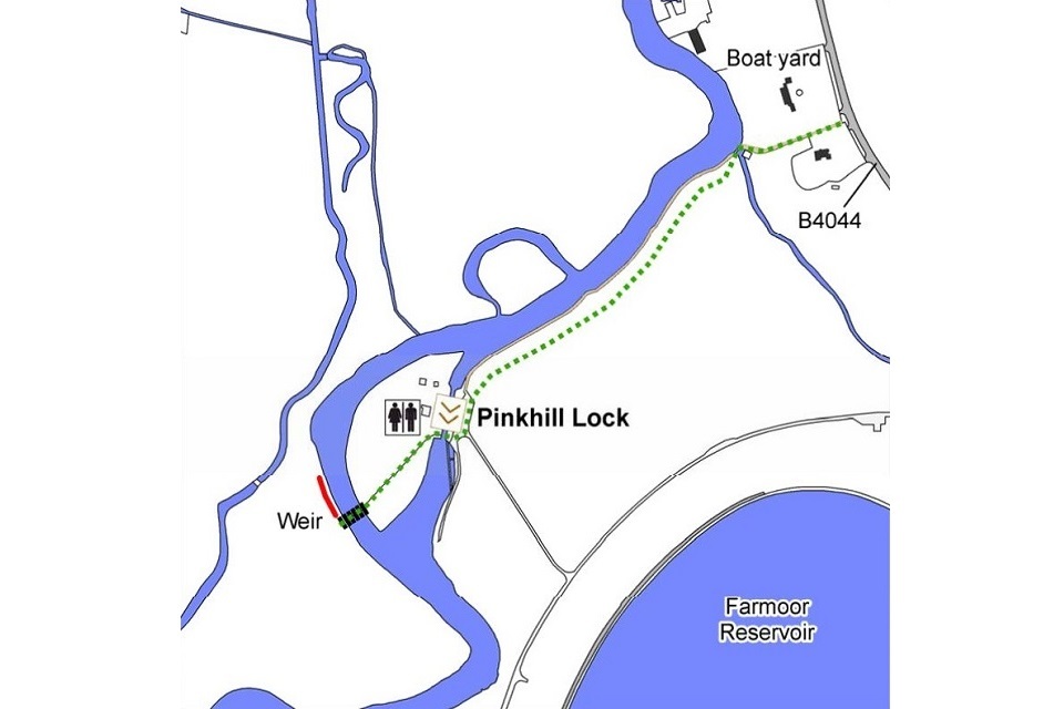 From the B4044 (Eynsham to Farmoor road), follow the footpath to the left of the boatyard. Cross the footbridge and follow the river upstream to the lock.