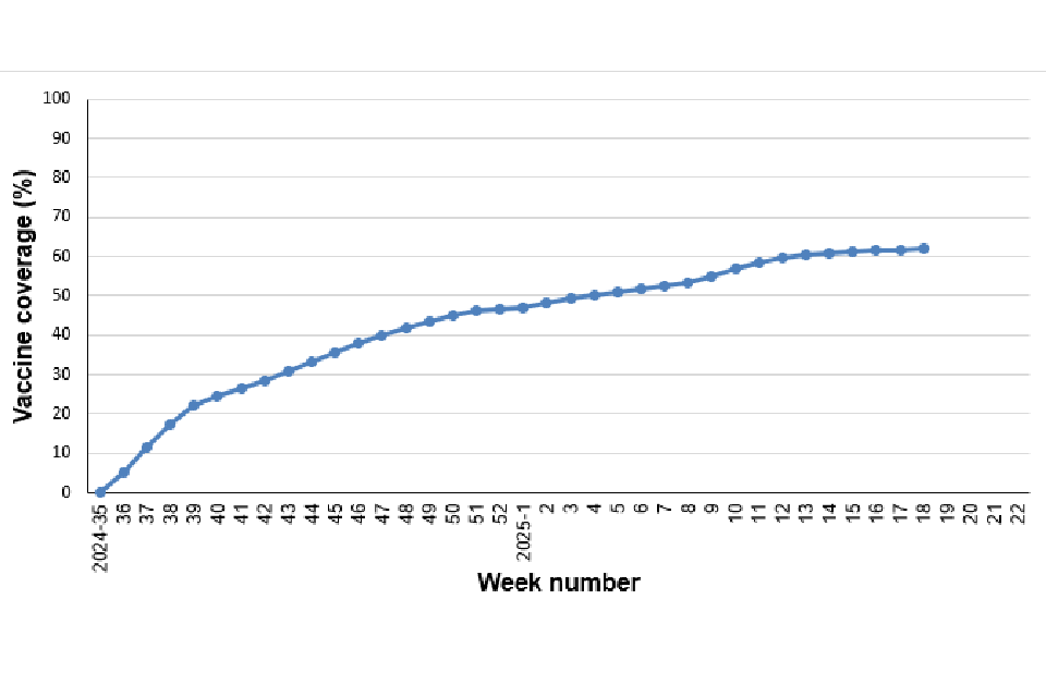 This is the seventh in the series of older-adult RSV vaccination coverage reports that will be released monthly, providing cumulative vaccination uptake data since the start of the campaign. The reporting period in the current report is from 1 September 2024 to 30 April 2025. Data is collected through the Immunisation Information System (IIS), which holds denominator data and captures vaccination events from GP practices and participating community pharmacies across England, based on data provided by NHS England.
