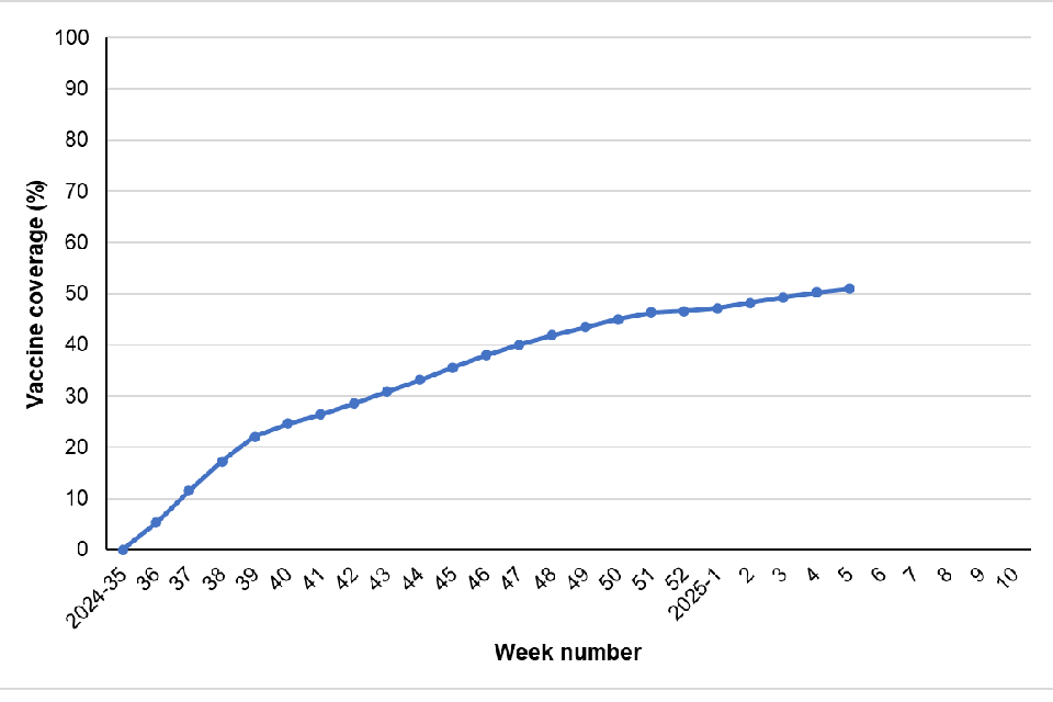 As of 31 January 2025, the overall vaccine coverage in the catch-up cohort (adults aged 75 to 79 before the programme start date) reached 50.8%, up from the 46.7% reported in the December 2024 report (1).