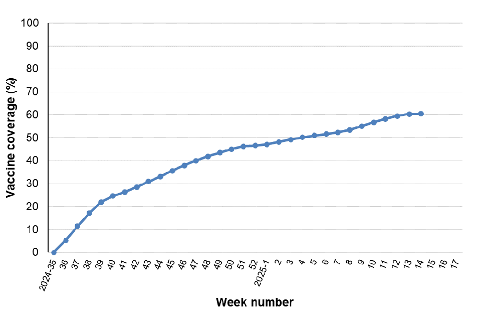 as of 31 March 2025, the overall vaccine coverage in the catch-up cohorts (adults aged 75 to 79 before the programme start date) reached 60.3%, up from the 54.8% reported in the February 2025 report (see Figure 1)(1)