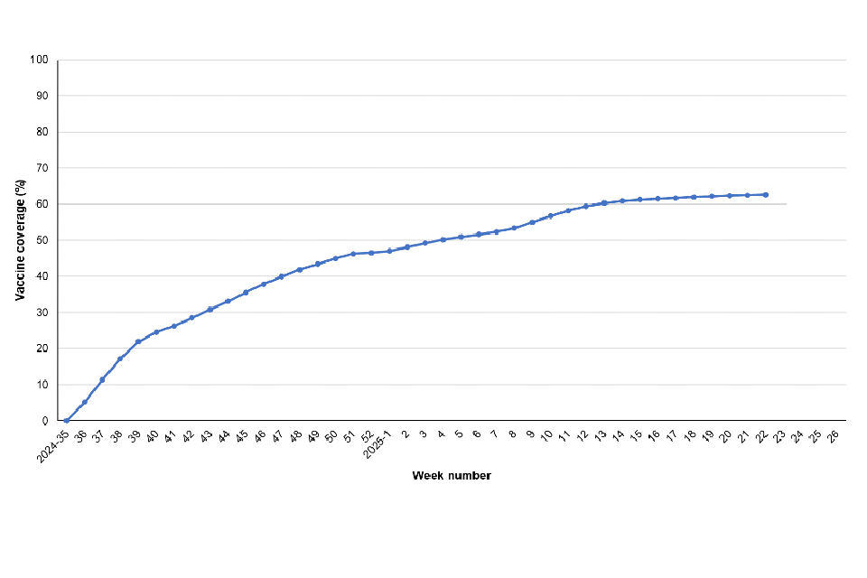 - as of 31 May 2025, the overall vaccine coverage in the catch-up cohort (adults aged 75 to 79 before the programme start date) reached 62.4%, up from the 61.8% reported in the April 2025 report (see Figure 1)(1)