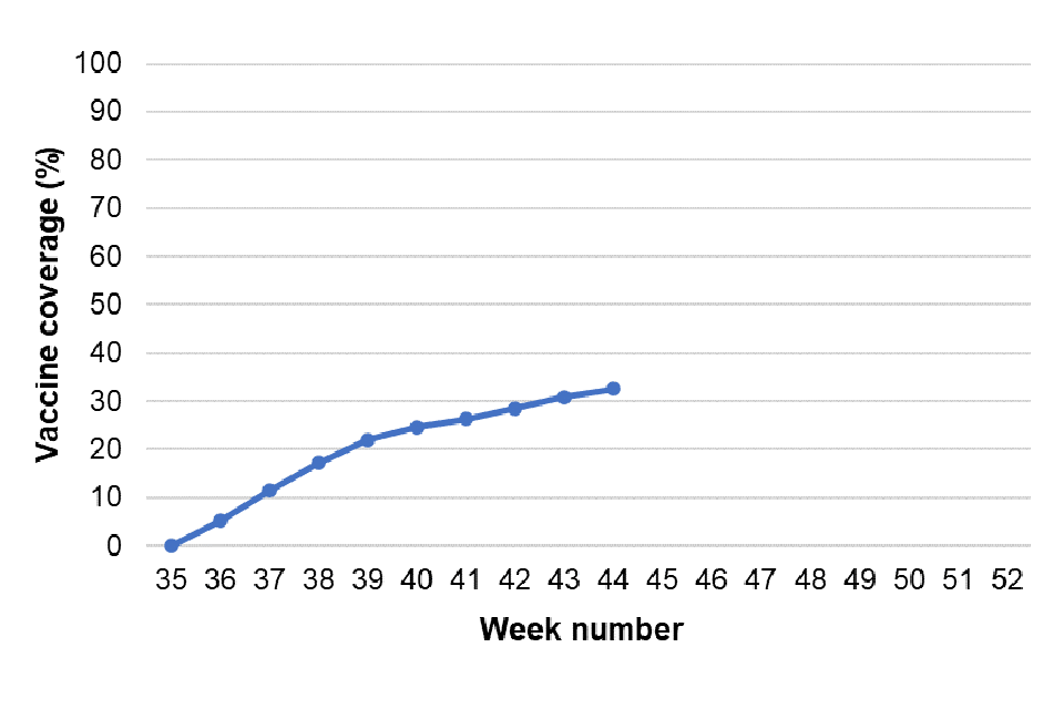 As of 31 October 2024, the overall vaccine coverage in the catch-up cohort (adults aged 75 to 79 before the programme start date) reached 32.6% in October, following the initial 22.6% reported in the September interim report (1).