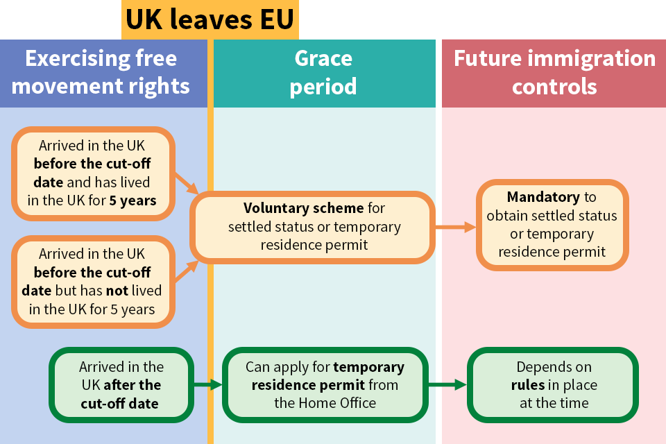 those EU citizens who arrived and became resident before the specified date but who have not accrued five years’ continuous residence at the time of the UK’s exit will be able to apply for temporary status in order to remain resident in the UK until they have accumulated five years, after which they will be eligible to apply for settled status;