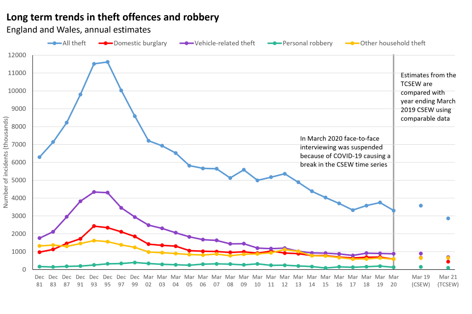 An important contextual element to view the findings of this report against is the COVID-19 pandemic and the resulting lockdowns and restrictions in mobility and the impact this had on crime. There have been significant decreases in acquisitive crime during this period due to the reduced opportunities for theft (Kirchmaier & Villa-Llera, 2020). Adjusted crime survey estimates indicate that acquisitive crime has decreased by 31% in the year ending March 2021 compared to the year ending March 2019.