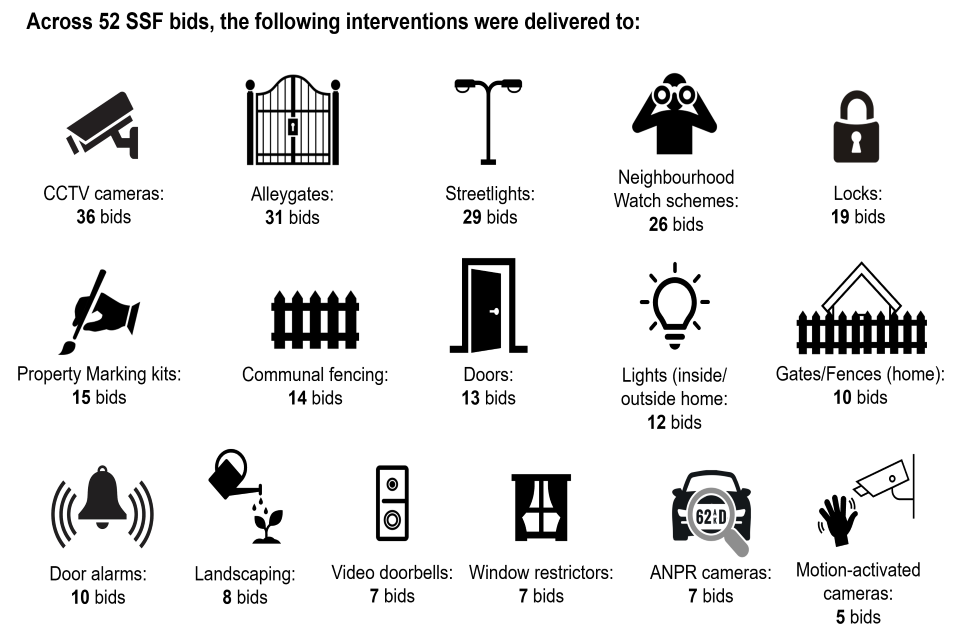 In this context, the Home Office announced a £25million Safer Streets Fund (SSF) in October 2019, to tackle acquisitive crime in persistently and disproportionately affected areas (Home Office, 2021). Police and Crime Commissioners (PCCs) across England and Wales could bid for funding (up to £550,000 per bid) for situational interventions aimed at preventing acquisitive crime and burglary in residential areas using a problem-solving approach (ibid)[footnote 3]. To help PCCs identify suitable interventions, the Home Office commissioned the College of Policing to develop an evidence-based situational crime prevention toolkit (College of Policing, 2021a). The key outcome measures of the Fund were defined as: