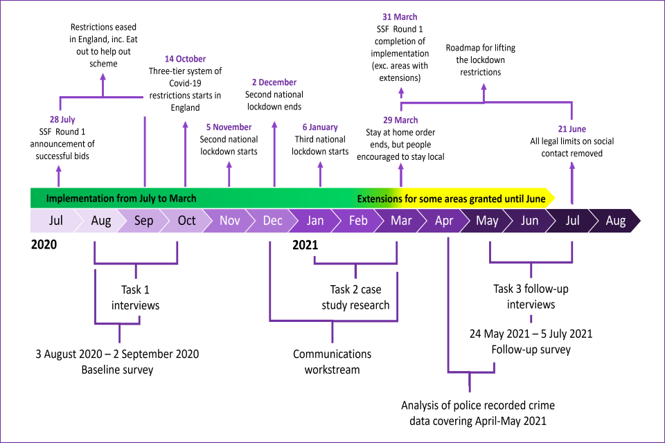 Figure 3 shows the timeline of key dates for the impact and process evaluation, alongside the implementation period related to SSF Round 1, and the COVID-19 pandemic lockdowns that coincided with this activity.