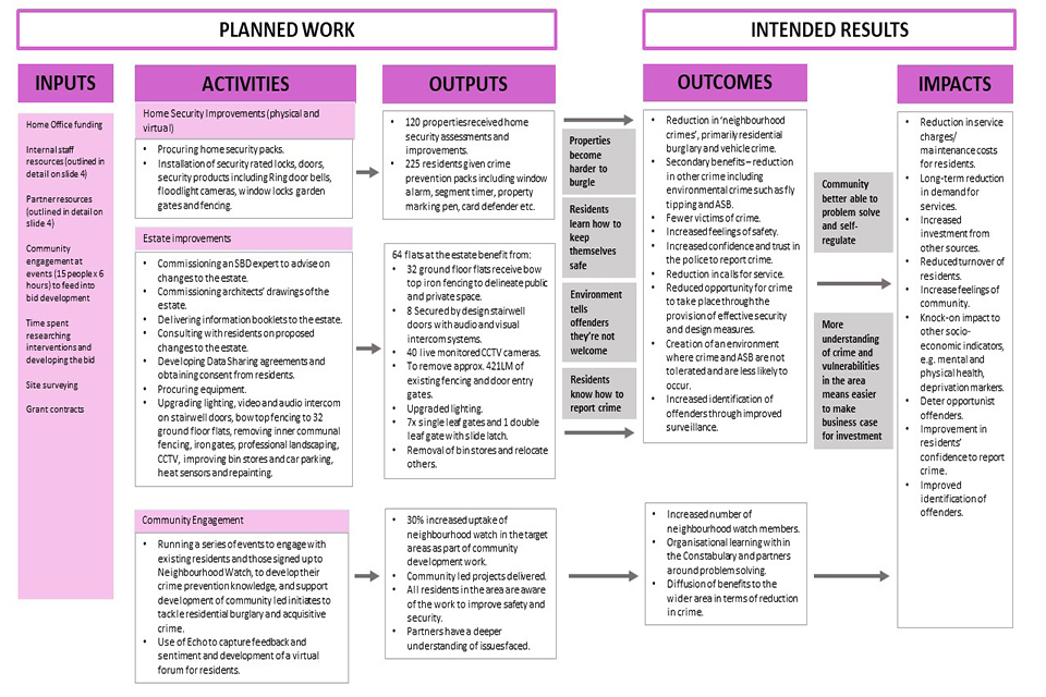 The evaluation team selected case studies reflective of the overall make-up of SSF areas covering all the key area characteristics, types of interventions, and target crimes of interest. The team explored the local implementation experience through in-depth interviews with bid team members leading the key interventions, and included an interactive exercise to draw up local level Theory of Change (ToC) models to help the evaluation team understand how the planned activities would result in a set of measurable outcomes[footnote 7]. The development of a ToC in collaboration with local delivery teams was a valuable exercise as it helped clarify how interventions were expected to work on the ground in the selected case study areas.